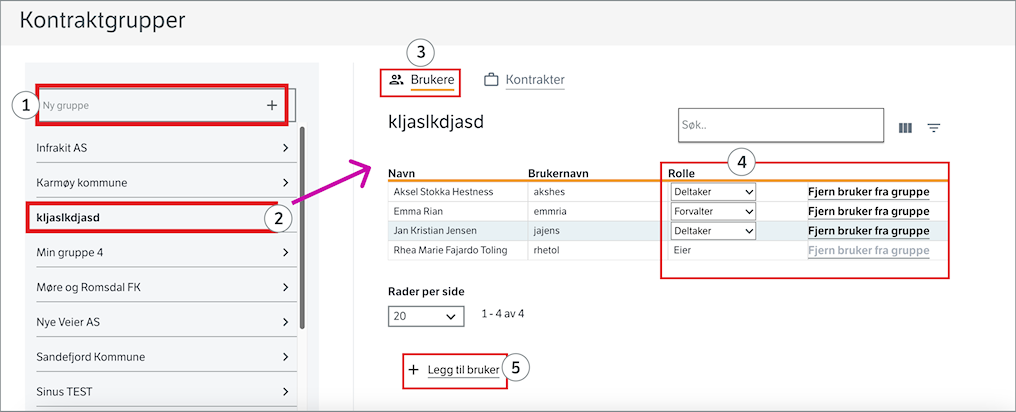 (3) Under “Brukere” vil du se alle brukerene som er tilknyttet kontraktgruppen og hvilken rolle de har.