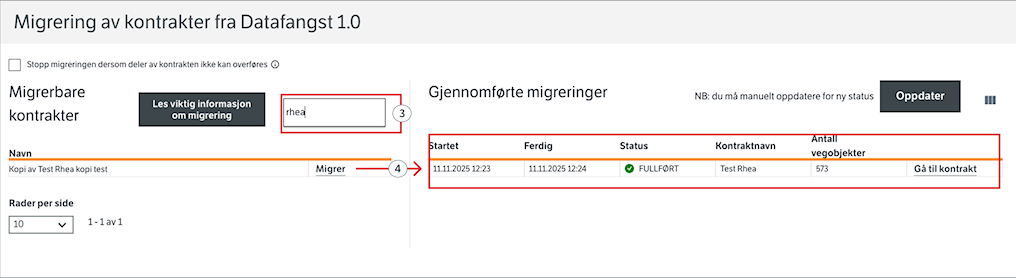 (4) Trykk på “Migrer kontrakt” i raden til kontrakten du ønsker å kopiere. Migrerte kontrakter vil flytte seg til høyre siden. Sjekk om status sier "fullført" eller om den avvises.