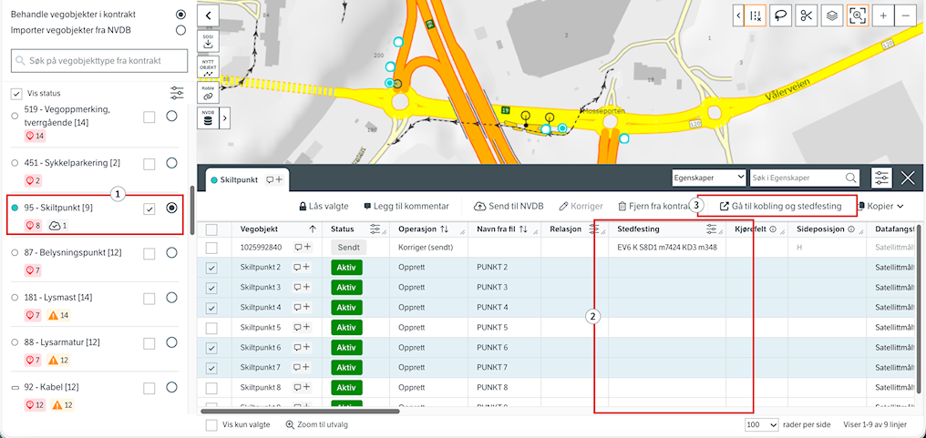 Venstremenyen gir deg en oversikt over vegobjekter som mangler stedfesting. Målet er å stedfeste alle vegobjektene slik at statusene forsvinner, ettersom du ikke kan registrere vegobjekter til NVDB uten stedfesting. Dersom vegobjekter i kontrakten skal være sammenkoblet, anbefales det at du kobler før du stedfester. Du vil få et valg om å gi samme stedfesting til koblede vegobjekter, slik at du slipper å gjøre dobbeltarbeid.