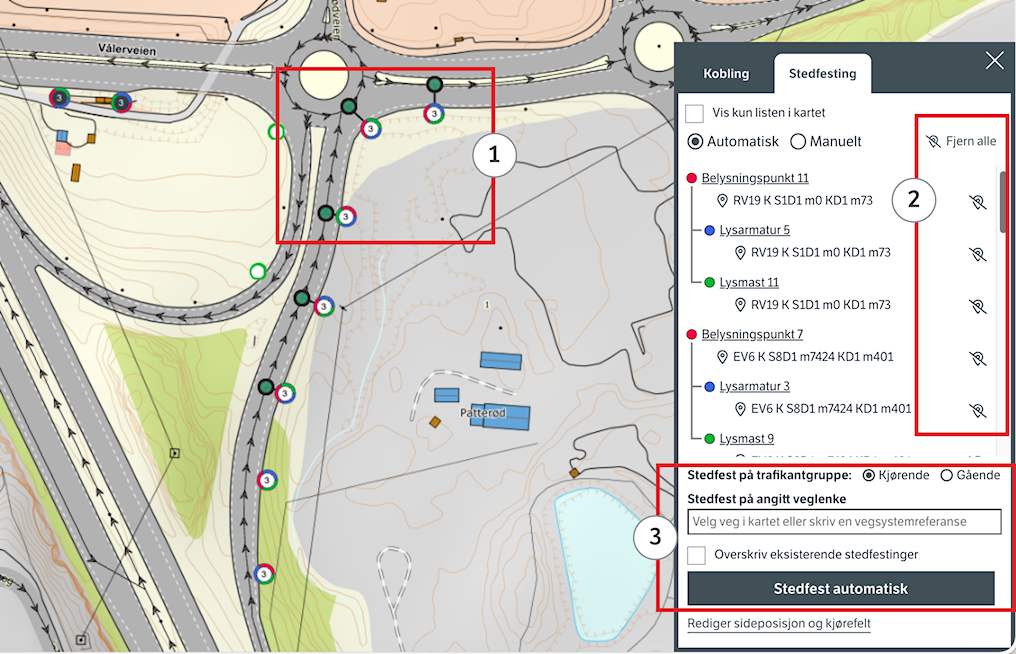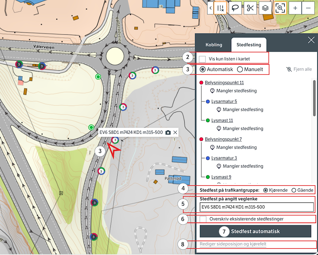 (3) Standarden er å la Datafangst automatisk stedfeste for deg. Dersom objekter får feil stedfesting eller ikke får stedfesting kan du prøve å stedfeste disse manuelt.