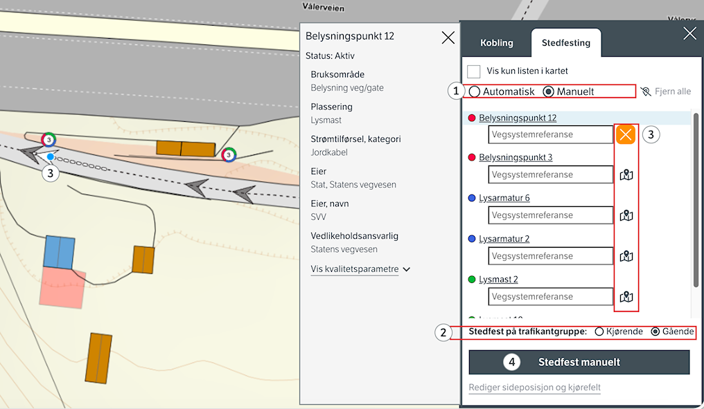 (1) Åpne stedfestingsboksen ved å trykke på vegobjektene i kartet eller via vegobjekttabellen. Trykk deretter på manuell stedfesting.