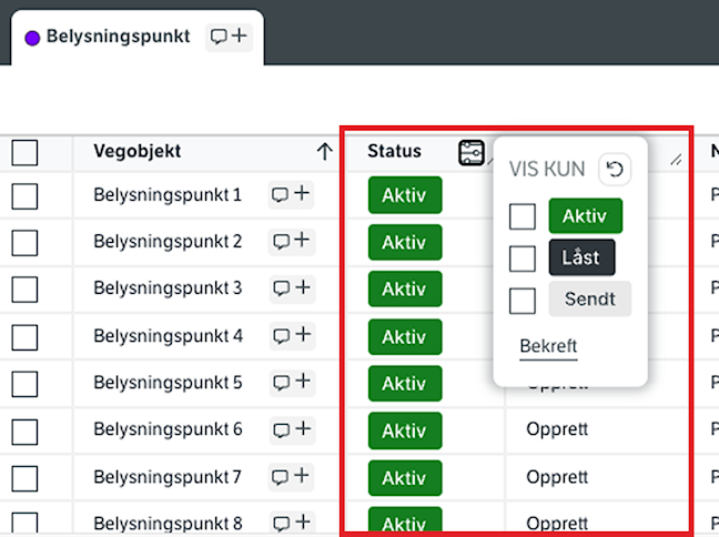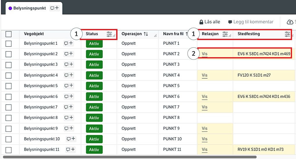 (1) Du kan filtrere på status, relasjoner og stedfesting i tabellen.