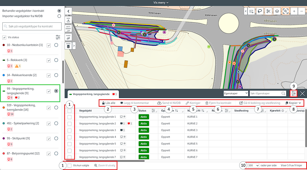 NB! "Huk av alle" fungerer kun på vegobjekter som ligger på samme side. Dette betyr at funksjoner som lås, send, vis kun valgte eller zoom til utvalgt også gjelder vegobjekter som finnes på siden. Unntaket er når du kopierer verdien til alle vegobjekter, da kopieres det på tvers av sider. Du kan endre antall vegobjekter per side i punkt 10 på bildet.