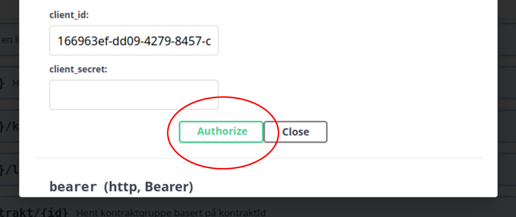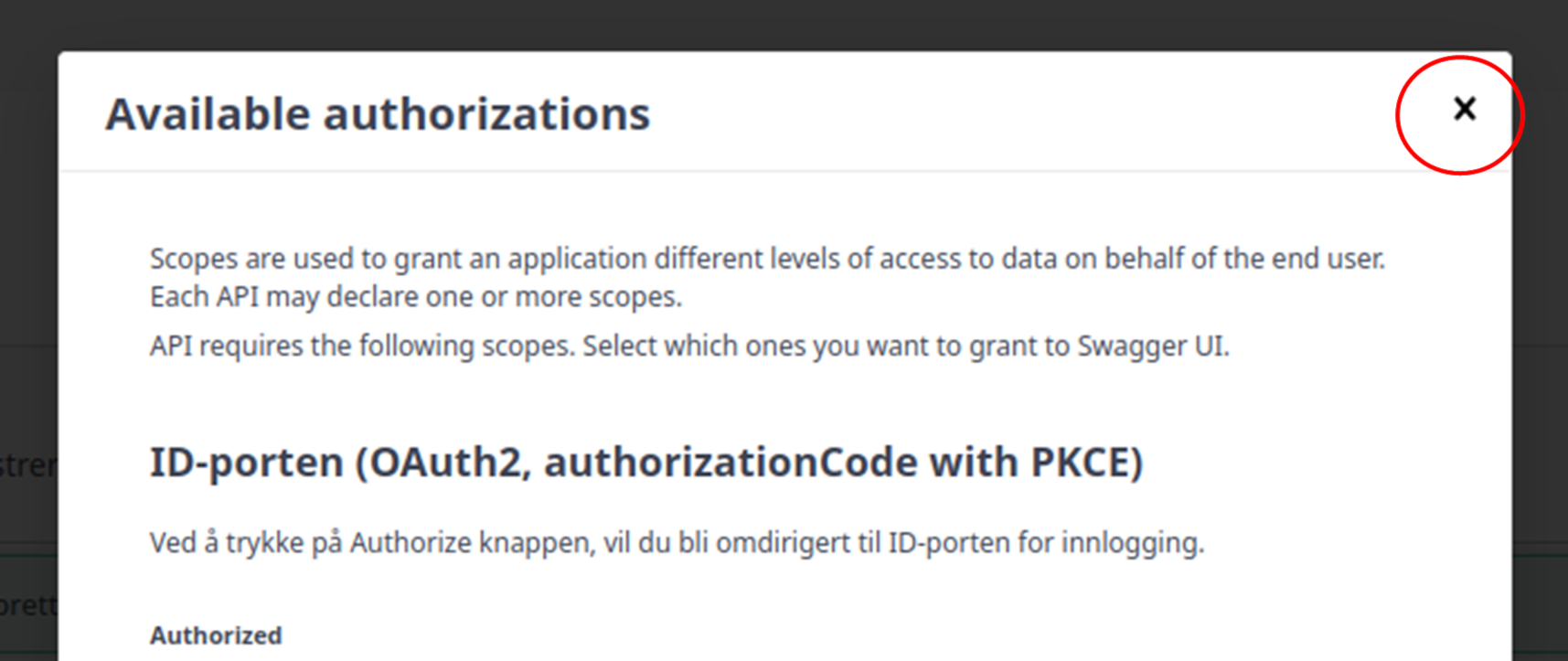 Når innlogginen er fullført, vil du komme tilbake i Swagger. Lukk autoriasjonsboksen ved å kysse den ut.