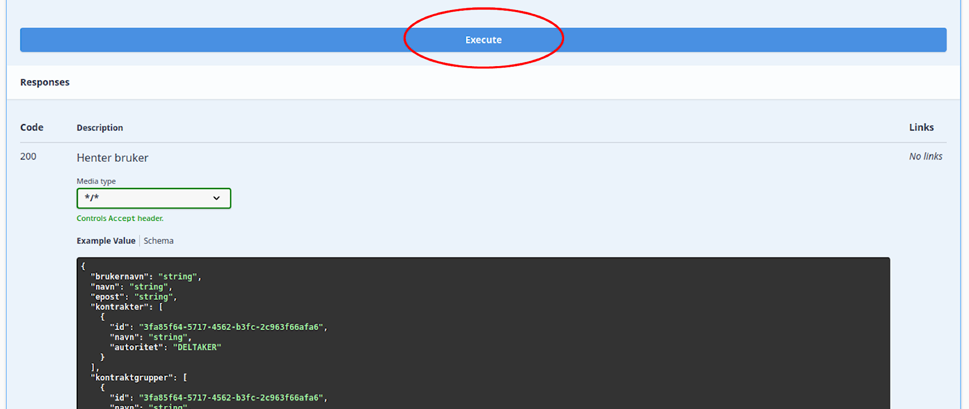 Du skal nå motta en Code 200-respons sammen med informasjon om din egen bruker. Når dette er mottatt, er alt klart, og du kan benytte alle tilgjengelige endepunkter.