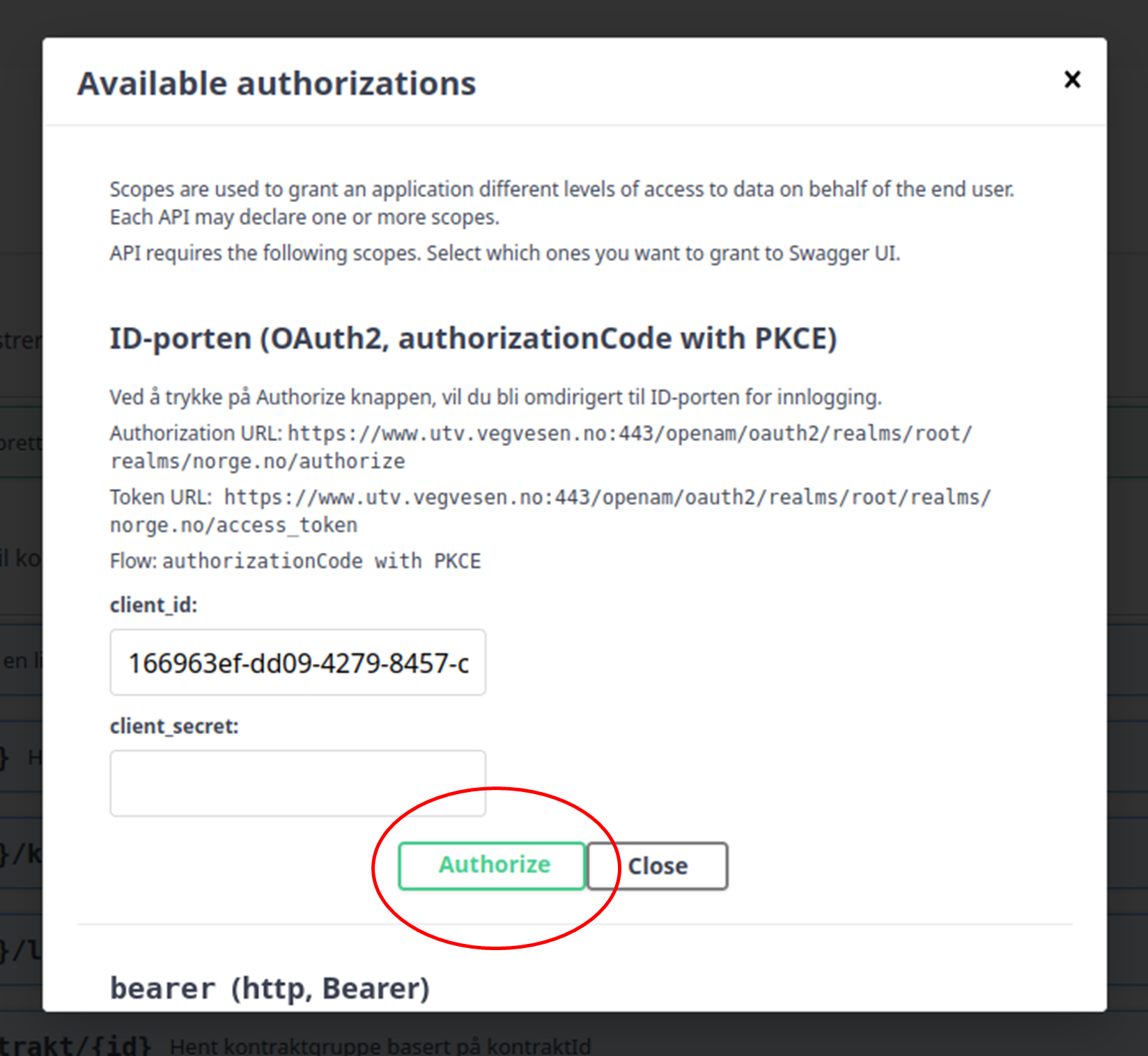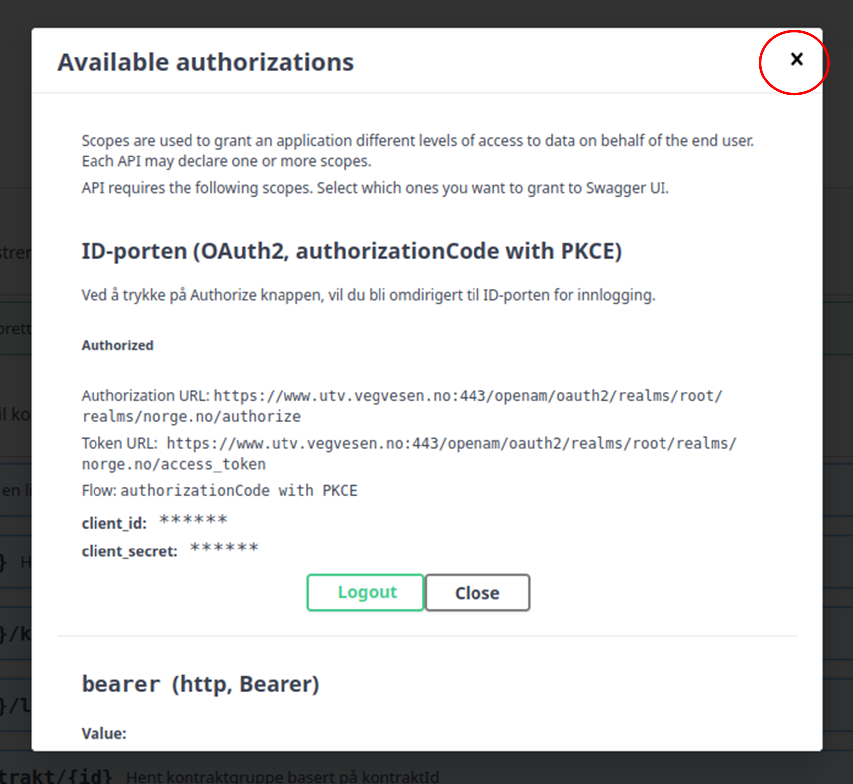 Når innlogginen er fullført, vil du komme tilbake i Swagger. Lukk autoriasjonsboksen ved å kysse den ut.